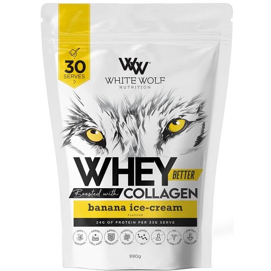 White Wolf Whey Better Protein + collagen is a supplement used by bodybuilders and athletes alike, an ultra premium Australian grass-fed protein blend, boosted with hydrolysed collagen which may help with hair, skin and nails.
